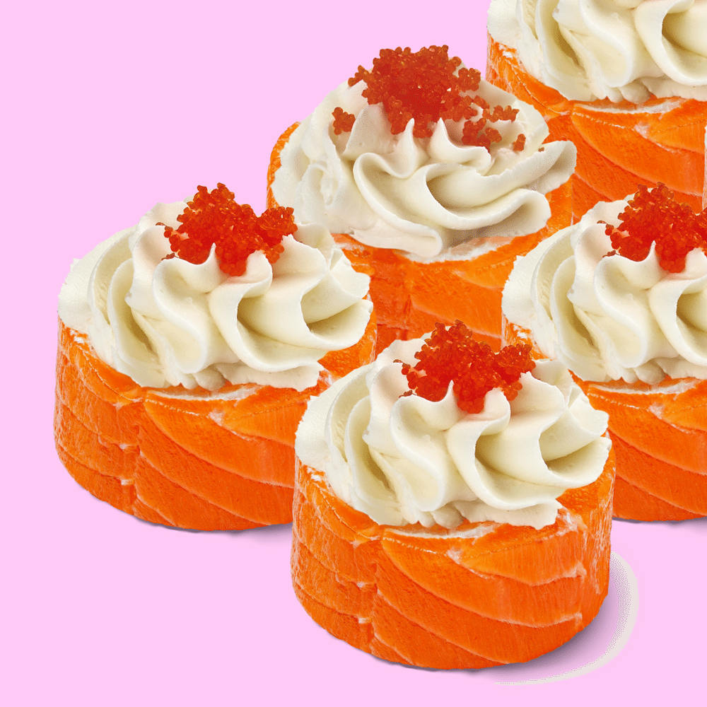 Лосось, икра и краб — сочетание для ужина по-королевски. Состав: лосось, краб с майонезом, икра масаго красная, сыр сливочный, огурец, нори, рис, мицукан, сахар, комбу, соль