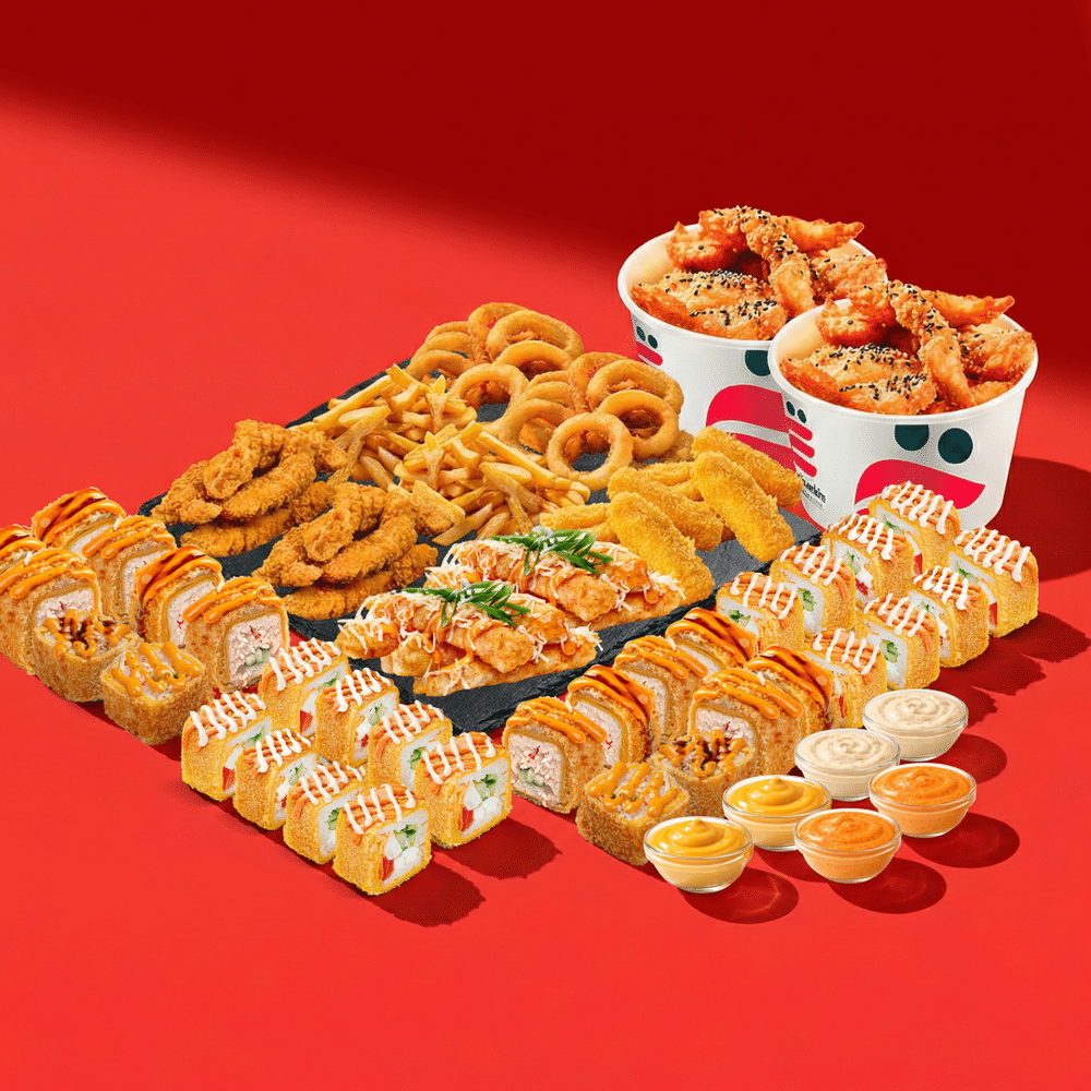 Максимальный объём для настоящих ценителей! Состав: Картофель фри* 2, Луковые кольца* 2, Стрипсы куриные * 2, Cырные палочки* 2, Лосось темпура* 2, Креветки темпура *2, Цезарь БИГ *2, Краб Темпура* 2, Соус Цезарь* 2, Соус Спайс* 2, Соус сырный* 2