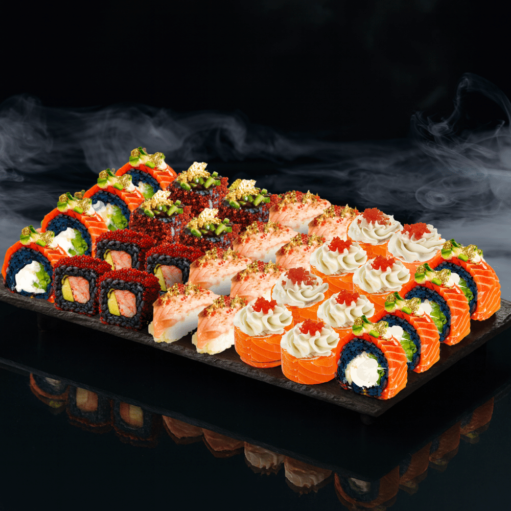 Золотой билет в мир гурманов: сочетание настоящего золота, свежего лосося и изысканных ингредиентов. Ешь и сверкай!Состав: Золотая филадельфия, Блэк-ролл с золотом, Филадельфия роял, Опалёный голден сяке.