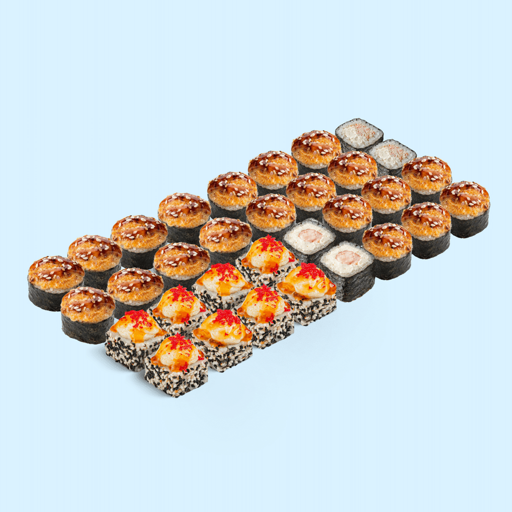 Самосвал запечённых роллов прибыл. Гриль, филадельфия и запеченные шапочки — БелАМ и поехали! Состав: Запеченная филадельфия с лососем и крабом, Гриль маки, Чиз маки креветка запеченный, Чиз маки с краб + запеченный.