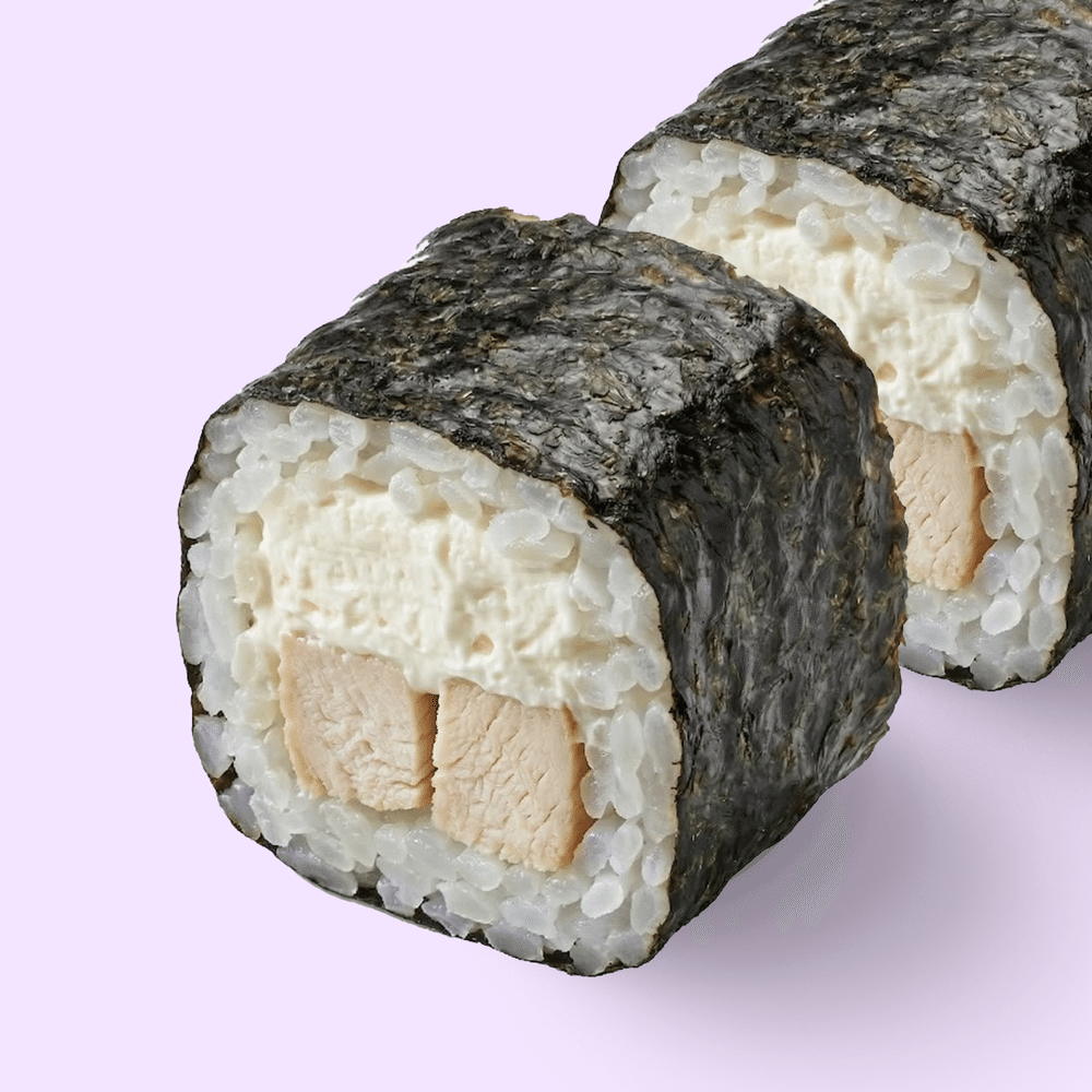 Простой и сытный ролл с курицей и сливочным сыром. Состав: нори, рис, курица, сливочный сыр