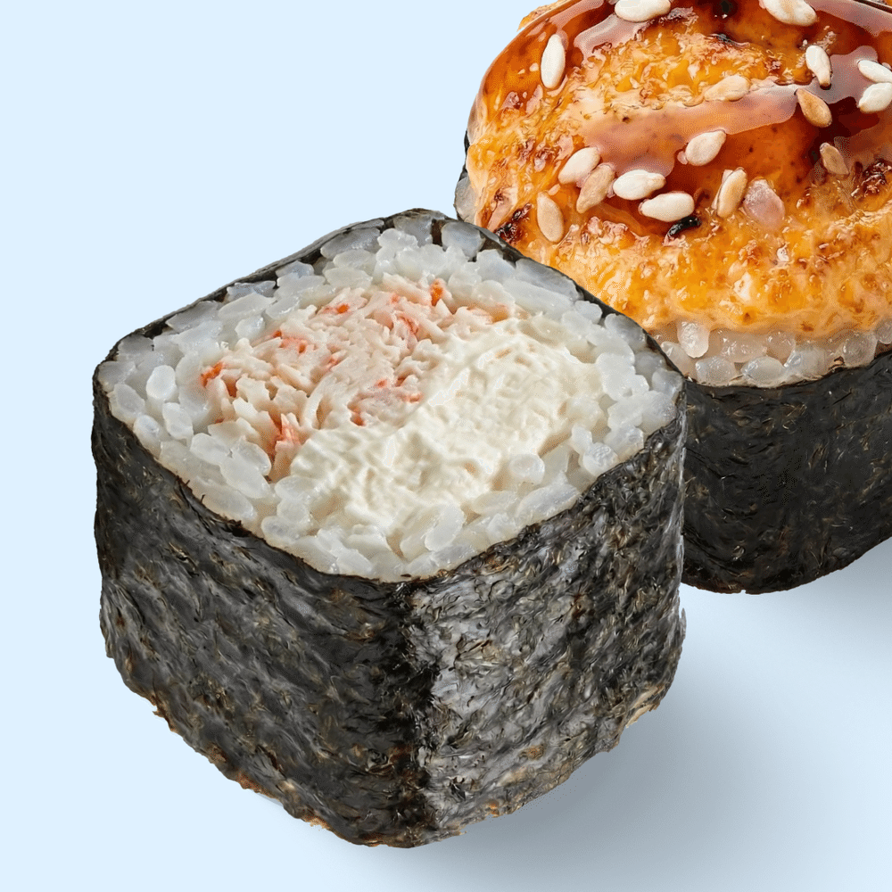 Классический ролл с крабовым миксом и сливочным сыром, запечённый сверху. Крабовый хит в запечённом виде. Состав: нори, рис, краб микс, сливочный сыр, запечённая шапка, унаги соус, кунжут