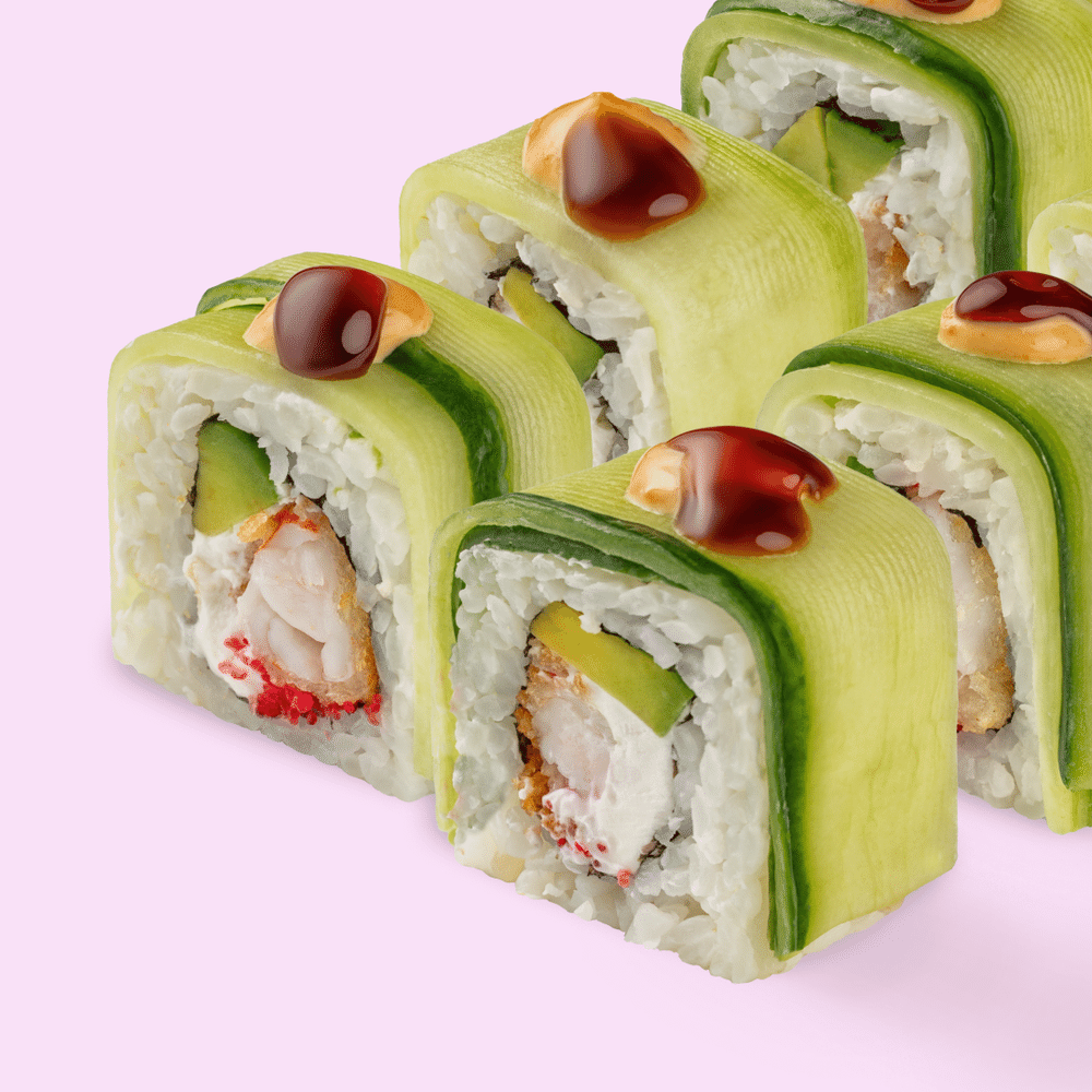 Яркий зелёный ролл, где хрустящая креветка в кляре встречается с кремовым авокадо и нежным сливочным сыром. Лёгкая остринка спайс-соуса и сладкие нотки унаги создают очень гармоничный и насыщенный вкус. Состав: нори, рис для роллов, сливочный сыр, масаго, креветка в кляре, авокадо, огурец, соус спайс, соус унаги