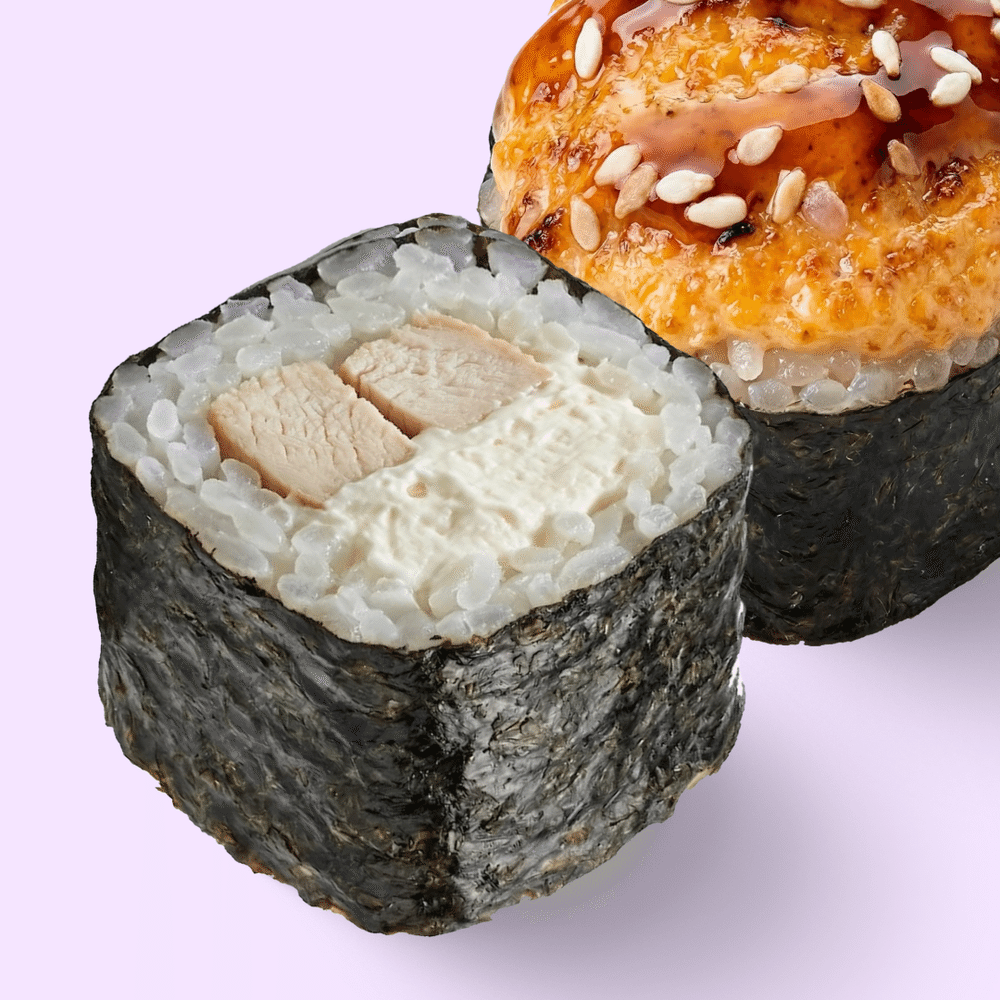 Сытный ролл с курицей и сливочным сыром, запечённый сверху. Отличный вариант для тех, кто любит насыщенные вкусы. Состав: нори, рис, курица, сливочный сыр, запечённая шапка, унаги соус, кунжут