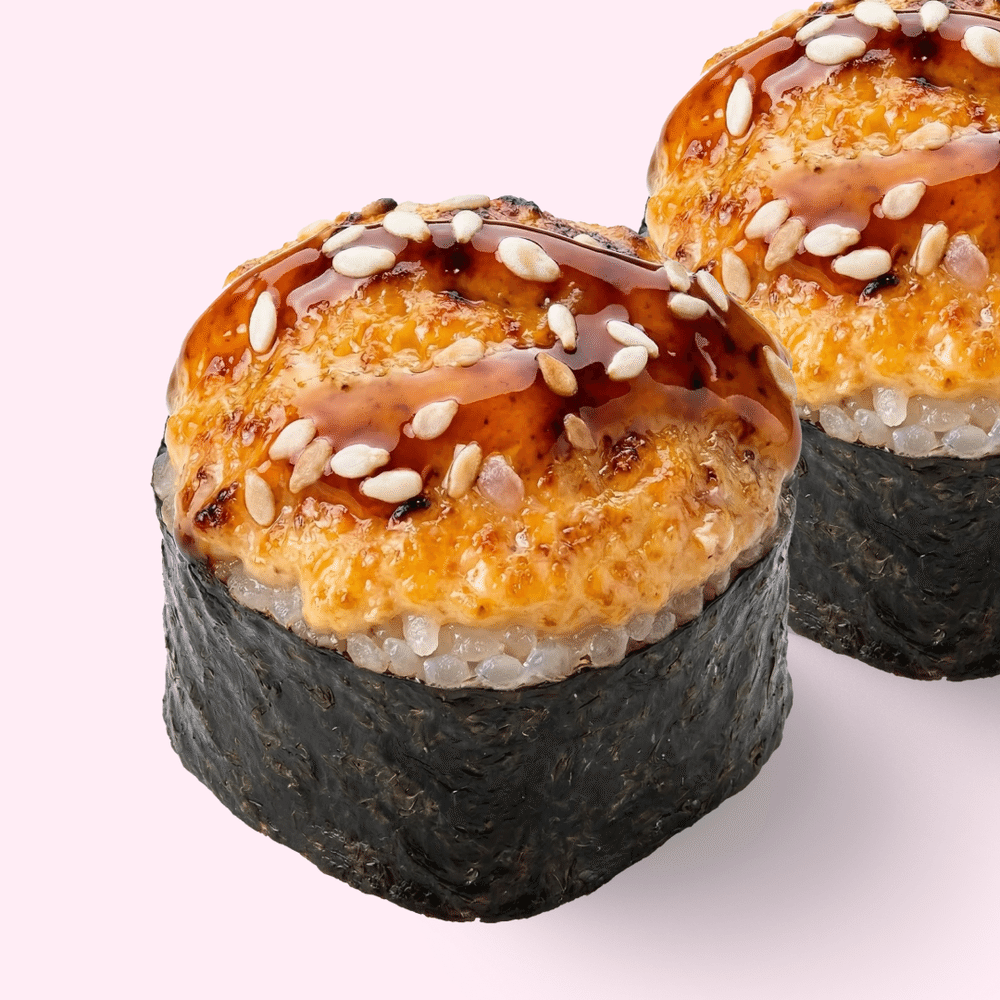 Горячий ролл с лососем и запечённой шапочкой. Горячий и аппетиный маки. Состав: нори, рис, лосось, запечённая шапка, унаги соус, кунжут