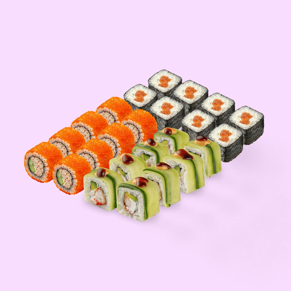 Название Буська говорит само за себя. Лёгкий поцелуй креветки с авокадо, свежий огурчик и лосось — сет, от которого хочется улыбаться. Состав: Эби грин ролл, Калифорния с огурцом, Чиз маки лосось